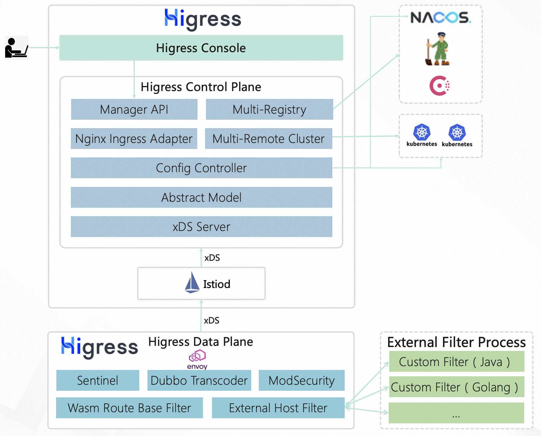 Powered by Istio and Envoy, Higress realizes the integration of the triple gateway architecture of traffic gateway, microservice gateway and security gateway, thereby greatly reducing the costs of deployment, operation and maintenance.