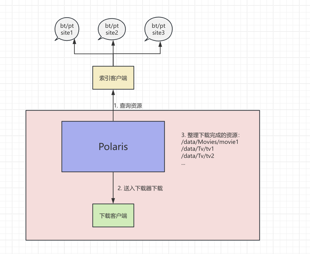 Polaris通过索引客户端查询相关的BT/PT站点,然后把查到的资源送到下载器,等待下载器下载完成对应资源。下载完成后,根据下载的对应资源,整理到对应的文件夹里去